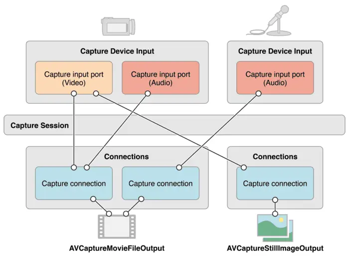 通过单个 session,也可以管理多个 input 和 output 对象之间的数据流,从而得到视频、静态图像和预览视图。input 可以有一个或多个输入端口,output 也可以有一个或多个数据来源。