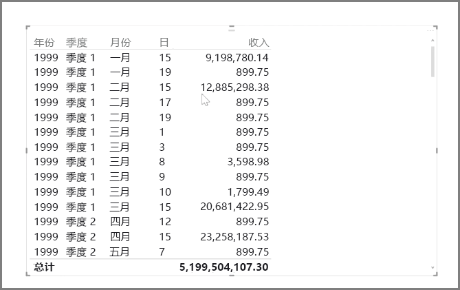 当你在报表中使用日期字段创建表格可视化效果时,Power BI Desktop 将自动包括按时间段分解的信息。 例如,Power BI 会自动将日期表中的单个日期字段分为年、季度、月和日,如下图。