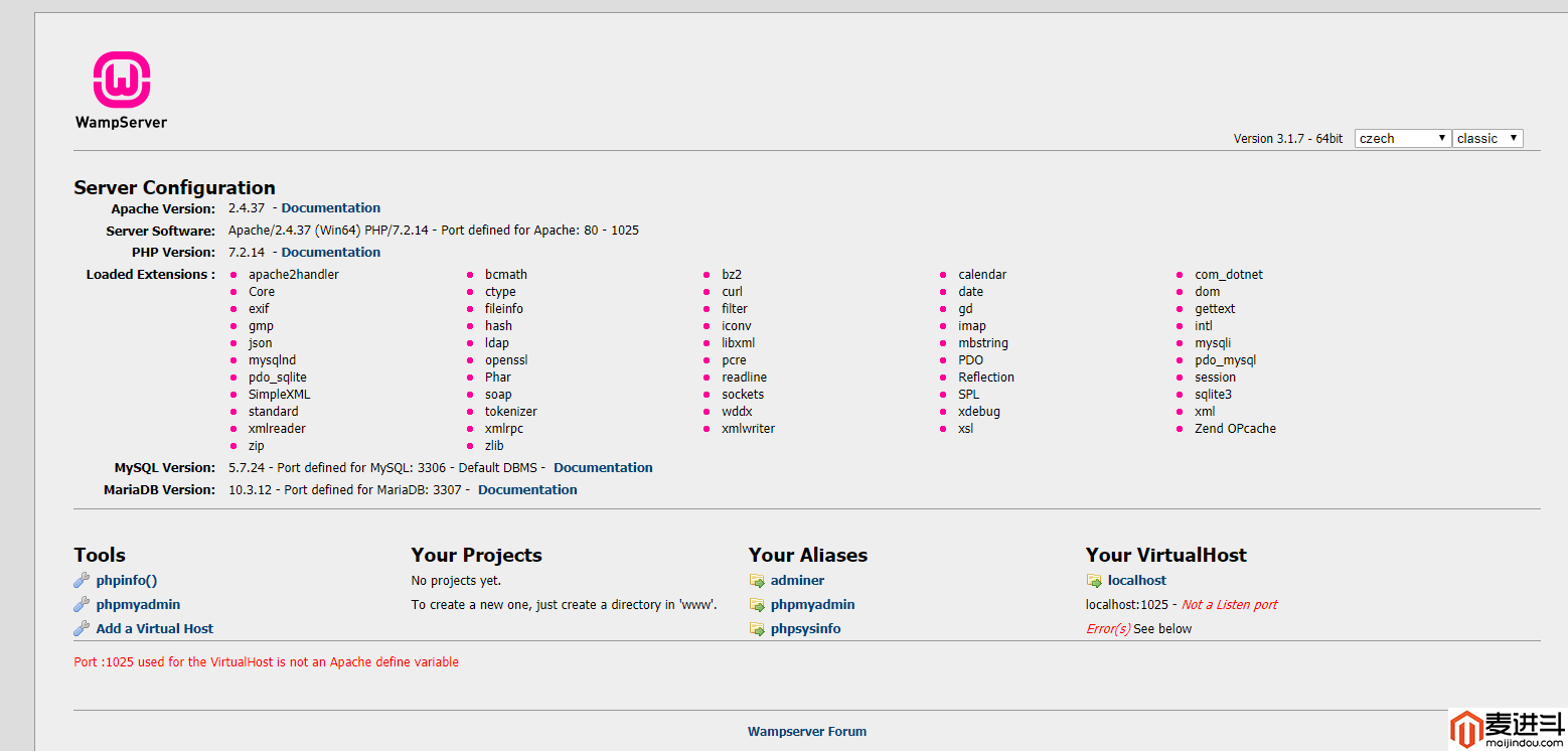 如何配置wamp后运行magento2 无敌大大 2019-03-14 288 阅读1分钟 1.首先需要下载xamp,图标显示为: 2.双击运行wamp图标就会出现在右下角,最开始为红色,之后为橙色,最后为绿色,红色为关闭的状态,橙色为正在启动的状态,绿色为启动的状态。 3.右击图标之后会出现一个界面,当中会有一个Language选项,选择chinese,如图所示: 4.Wamp会变成中文显示,有各种各样的语言包,可以选择,左击图标,为出现以下界面,里面就会有服务器,数据库等开发所需功能,没做一次操作就可以在这个界面最下方重新启动所有服务。 5.启动所有服务之后,打开浏览器,输入localhost,就会出现这个界面,说明你的服务器已经完美启动 6.接下来就是配置端口号以及虚拟机的配置,因为以后在打开时就会用到,因为要配置端口号进行访问到一些网址。下图就是打开虚拟机配置的位置。 6.打开之后的界面,后面有各个语句的配置 7.配置好之后,就可以访问到magento2前端页面,输入localhost:(端口号),回车,就可以看到前端界面。
