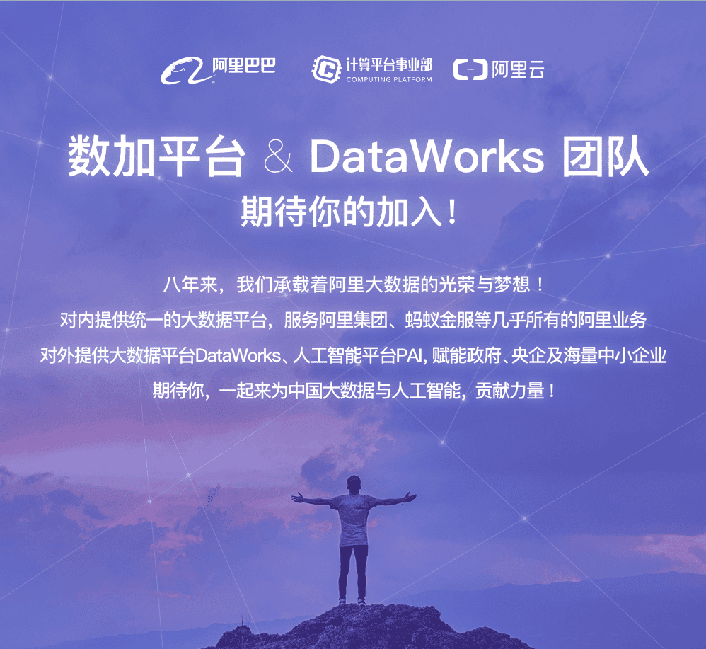 我们是阿里巴巴云数加平台 & Dataworks团队,为集团内部和外部阿里云客户,提供大数据平台和产品: