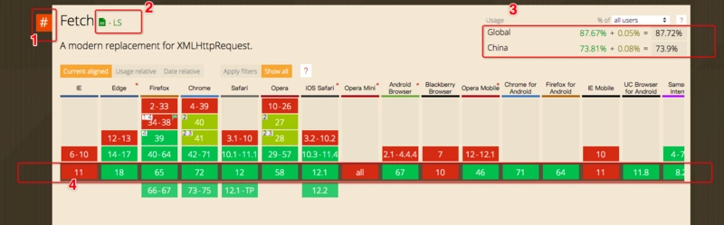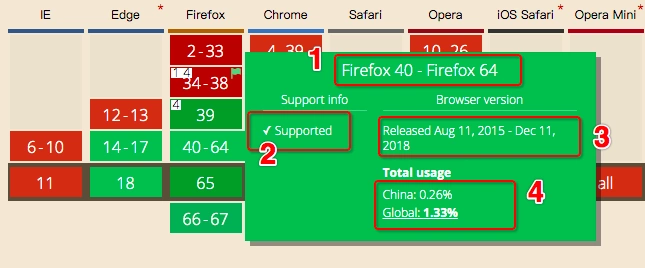 (4)浏览器基线,代表对应浏览器current状态的版本号。基线往上是该浏览器的低版本,并对相同支持情况的版本进行合并。基线往下是未来的三个版本,并进行状态合并。