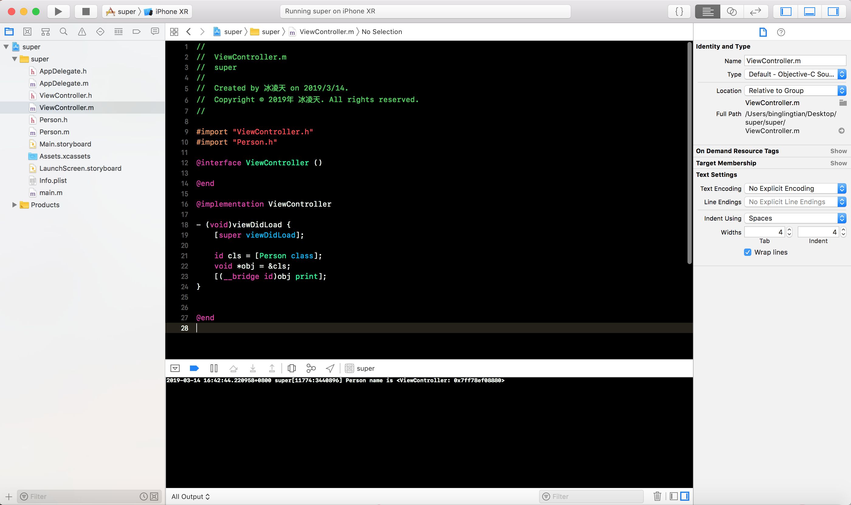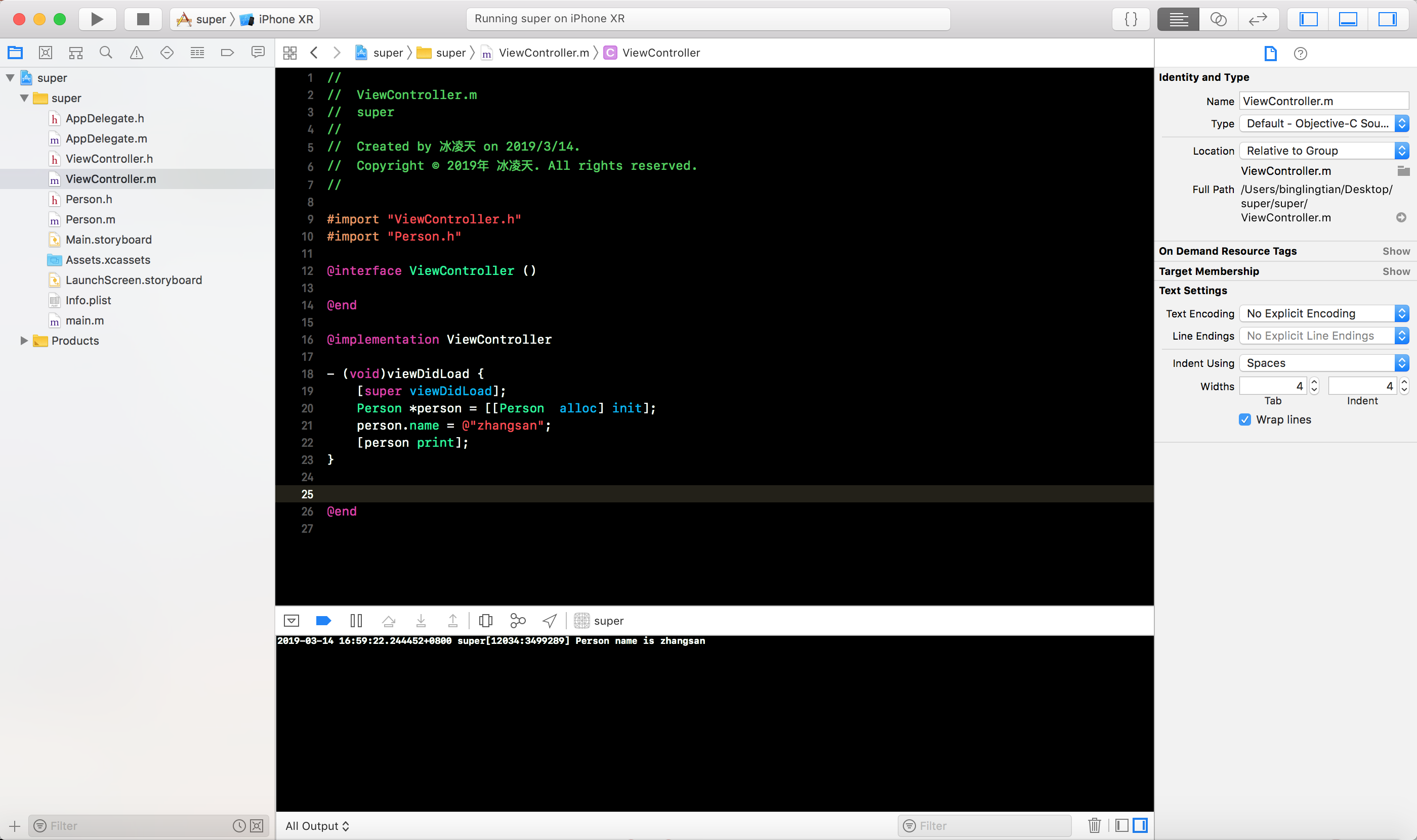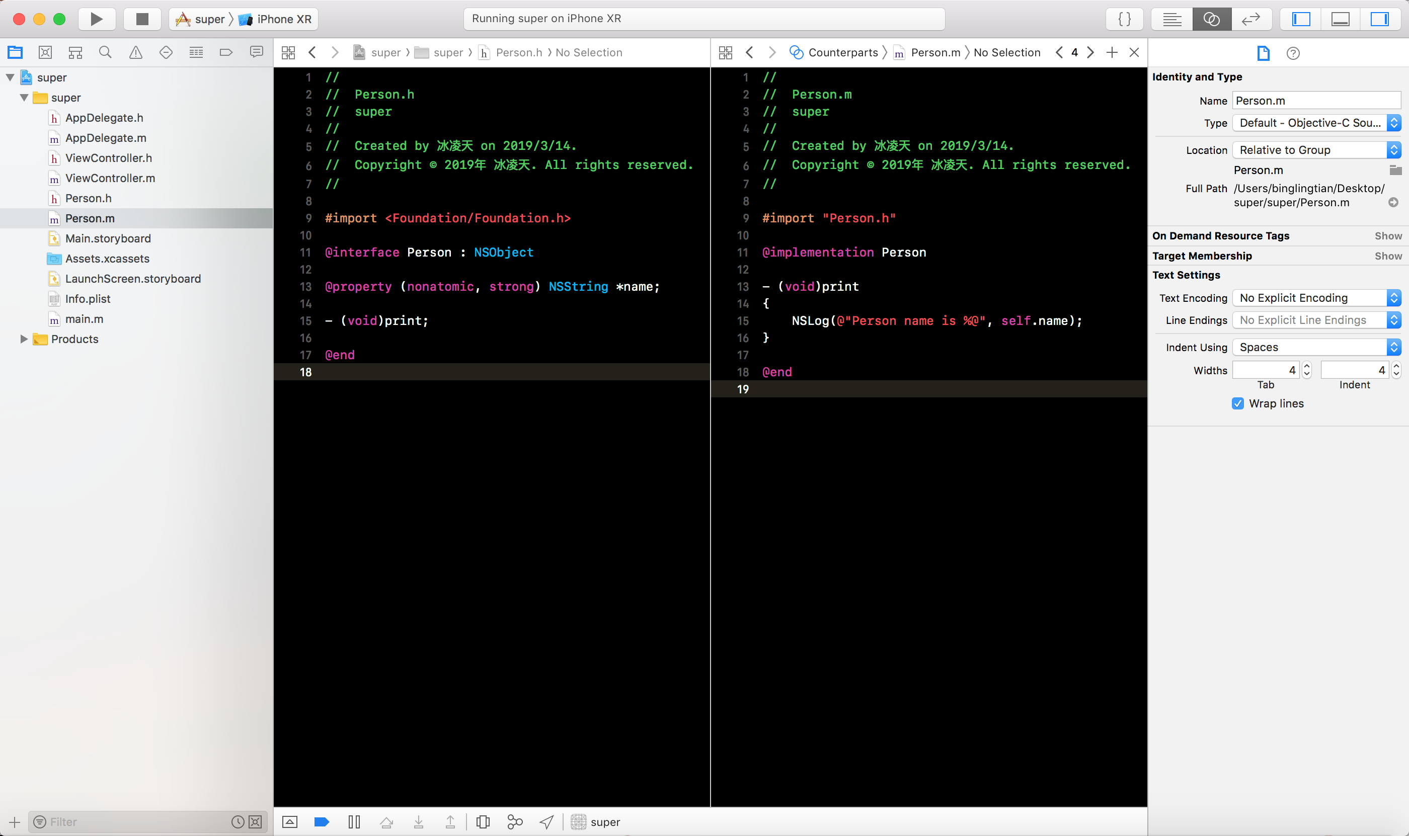 OC项目, 定义Person类, 添加name属性和实现print方法, 如下图所示