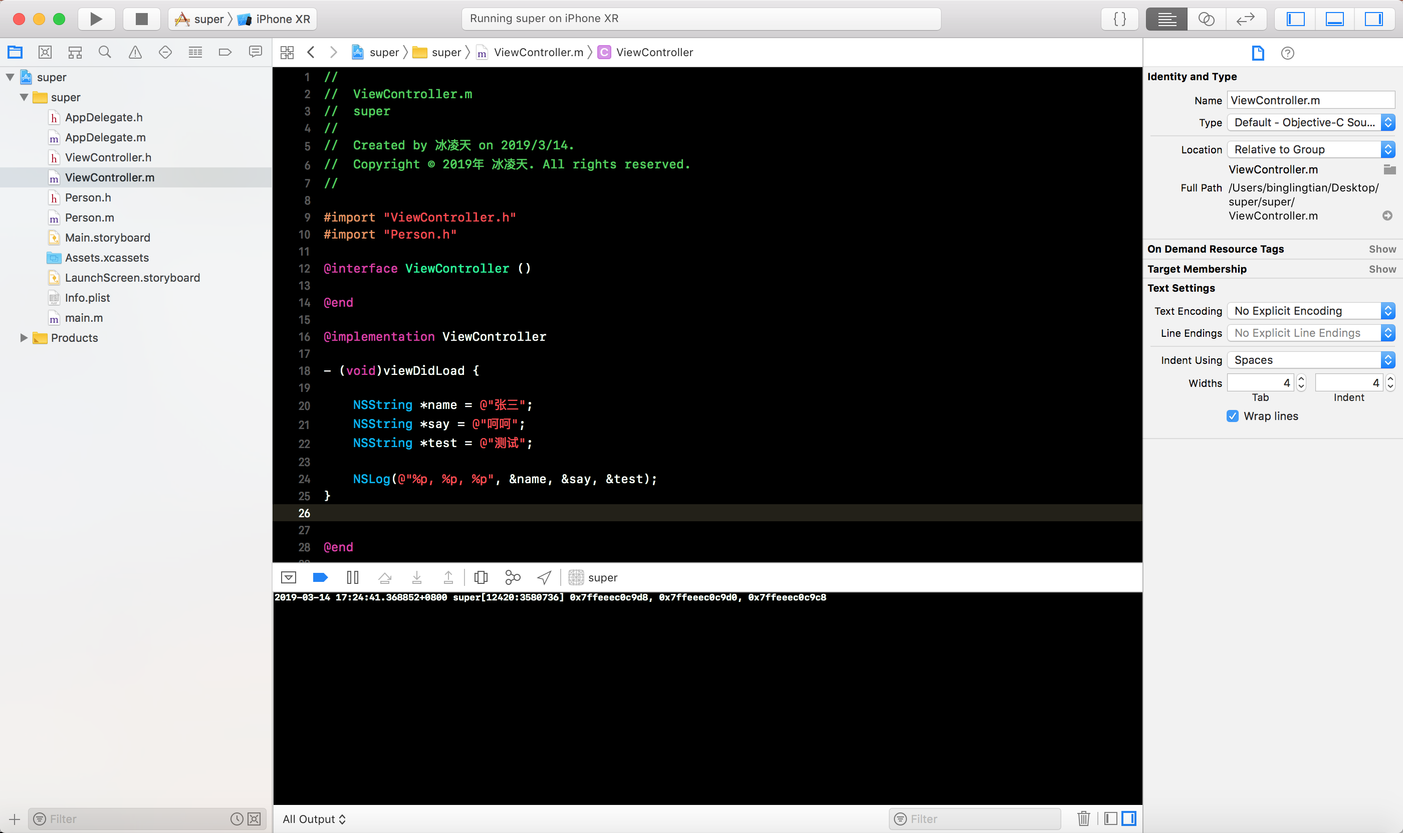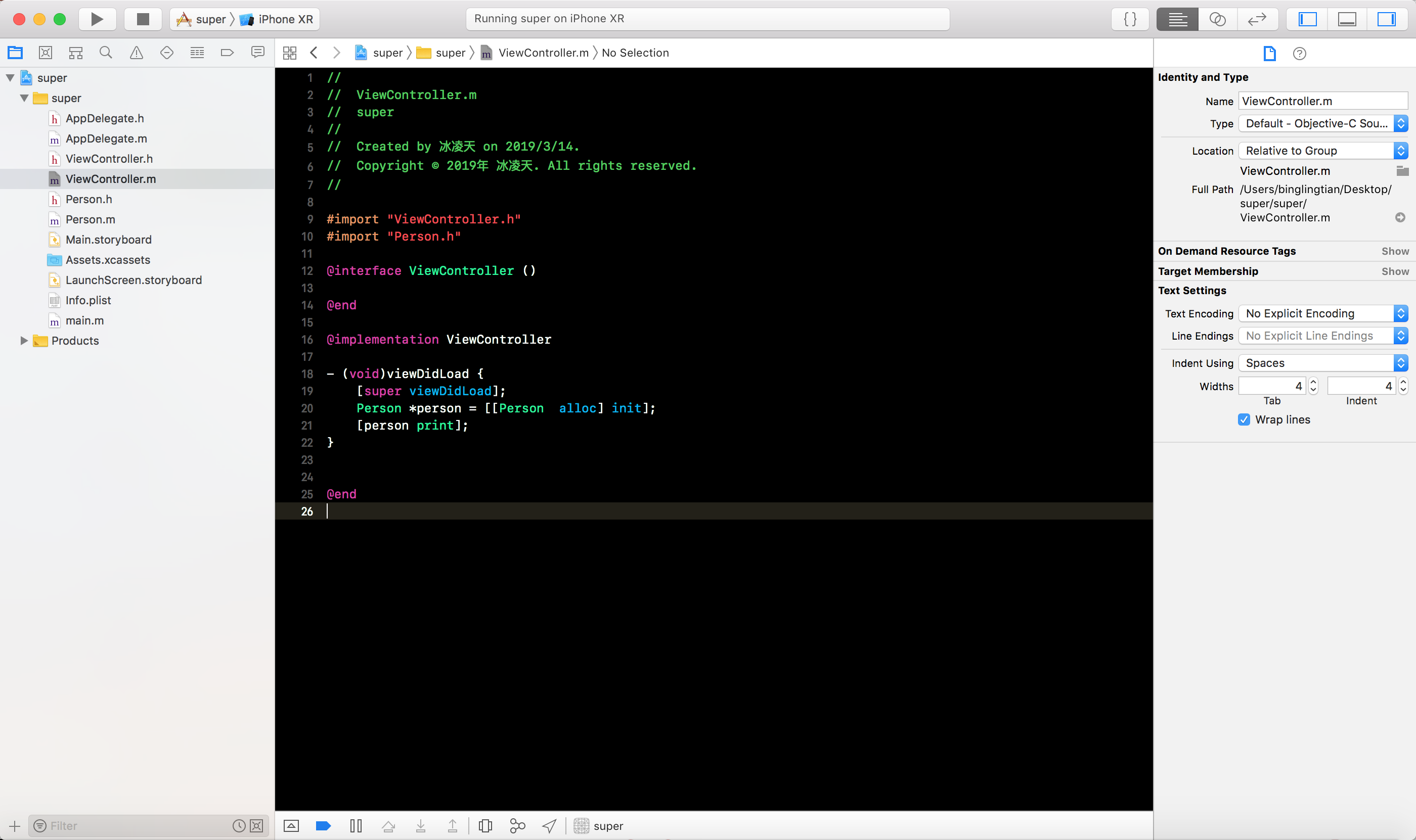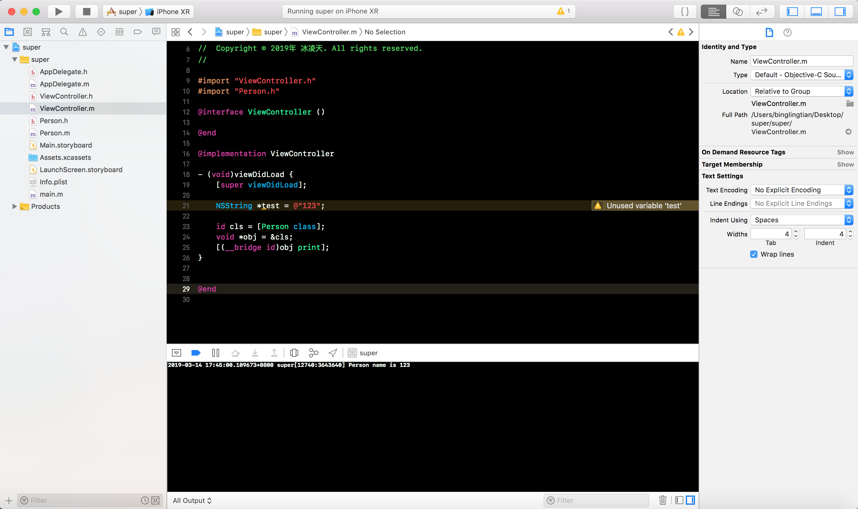 OC项目, 定义Person类, 添加name属性和实现print方法, 如下图所示