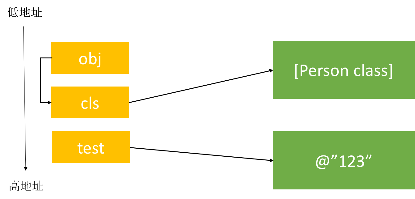 obj通过找到cls, 然后用cls的地址+8, 找到的就是test的地址, 所以打印时, 找到的_name就是test的值123