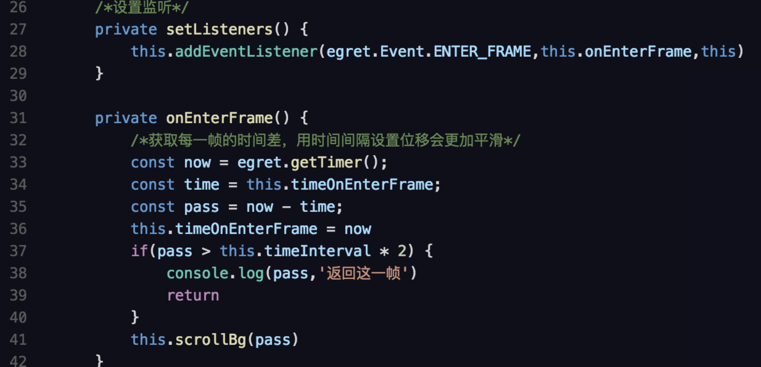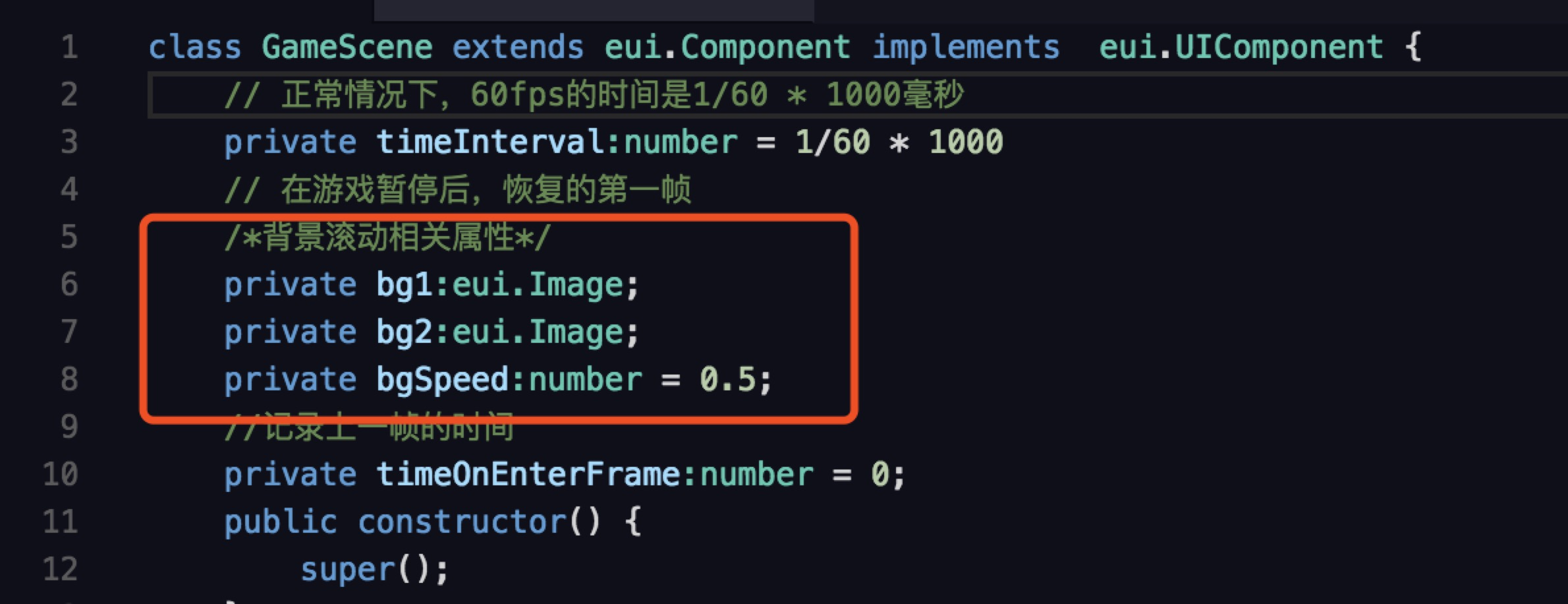 因为两张图片是一模一样的,我们只要让bg1在超出屏幕后,让它回到原点,然后bg2再重置于bg1之上即可。注意,此处位移我们是使用时间的间隔*速度,而不是每帧都加相同的位移,与时间相关是为了让位移更加平滑。