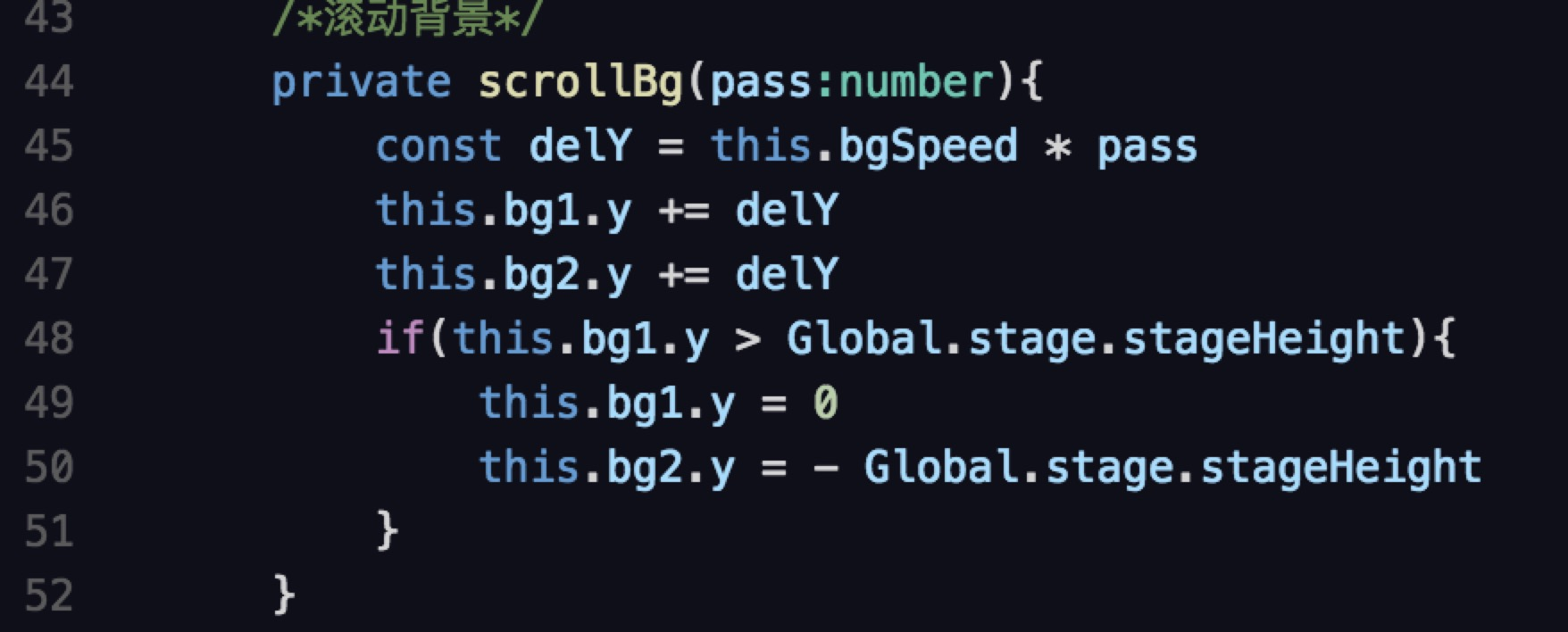 背景的的滚动就是一张上下都能衔接的背景图片,使用两个egret.Image对象,不停地交换位置就可以实现无限滚动。