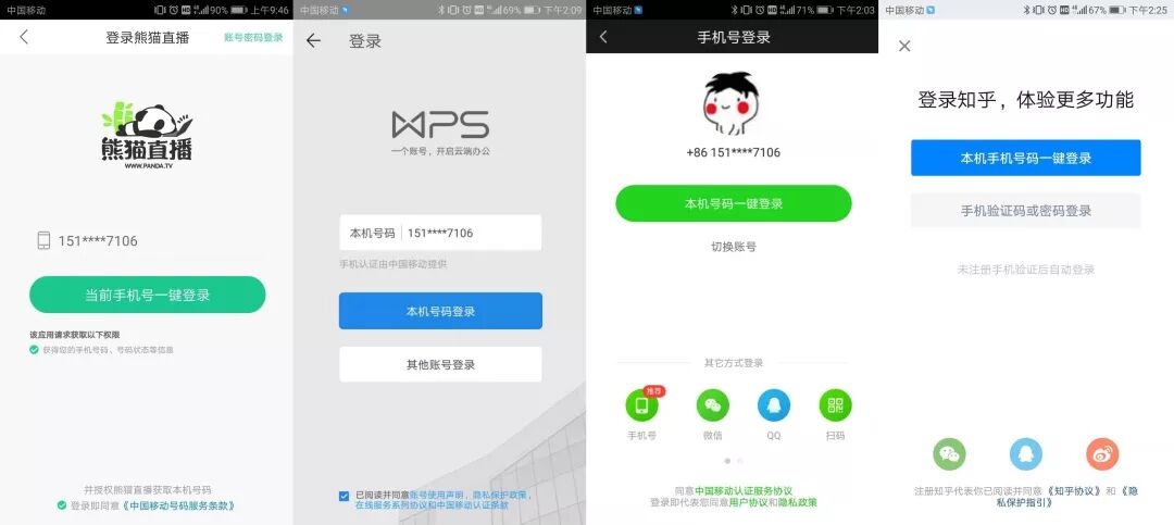 而在市场上,大量的非运营商旗下的APP也开始接入这一功能,例如知乎、熊猫TV、爱奇艺、芒果TV、360手机助手、快手、美图、一点资讯、美柚、蜻蜓FM、WPS office等APP都已接入了“本机号码一键免密登录”验证方式。