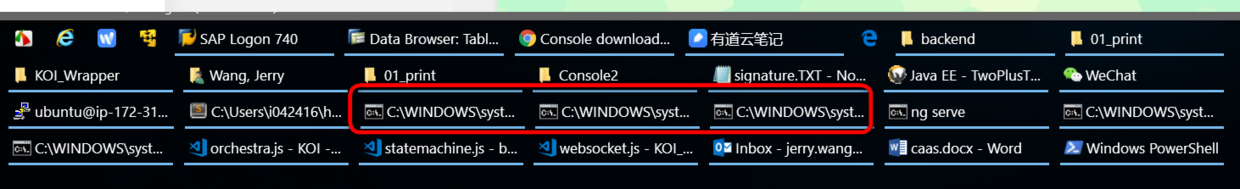 最近我在做基于nodejs的微服务开发,需要在windows命令行里启动很多微服务。我的windows 10任务栏是这样子的: