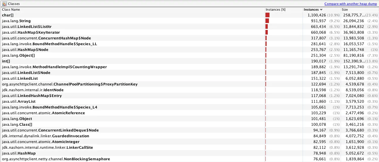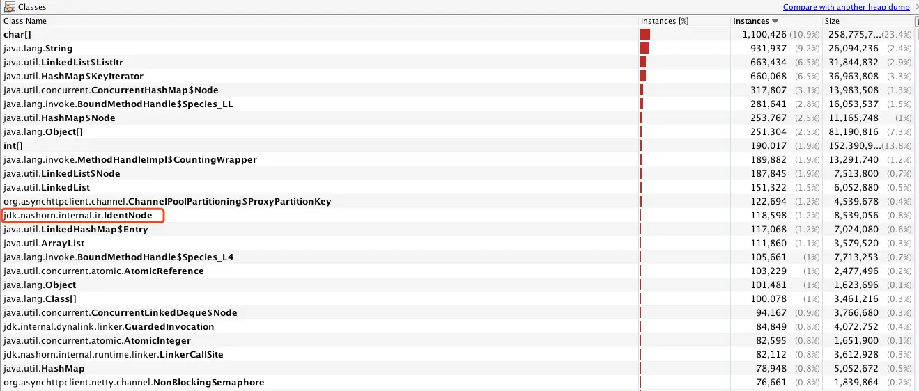 -XX:+PrintReferenceGC参数,经过一段时间观察,应用重启后,观察了一段时间,发现gc日志中JNI Weak Reference处理时长变得越来越长。而且占用整个ygc时长的大部分。 - 再回到刚刚dump的那张图里面,能看到实例数排在前面的也有nashorn引擎相关的内容,如下图,现在几乎可以断定问题出在的执行某个javascript脚本。