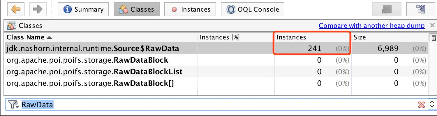 Classes栏目,直接搜索Source$RawData,可以看到有241个实例,如下图 ,这241个,然后找了出现频率比较高的几个js脚本,然后看了对应脚本的调用方式,发现其中一个脚本每次执行都是通过ScriptEngine.eval这种方式来执行,就造成了``JNIHandleBlock```,不断增长的问题,最终导致ygc时,处理JNI Weak Reference的时间越来越长。 - 如何解决:修改了这个脚本的调用方式。不用每次执行