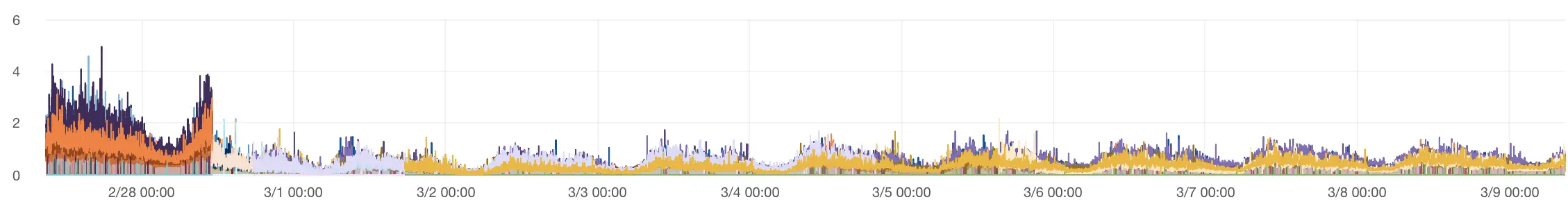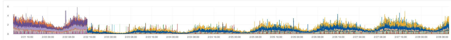 。 - 然后看下ygc近期耗时的走势图,下图纵坐标每10分钟gc总耗时(单位:s),横坐标日期,可以看到在2月22号应用重启后gc总耗时降下来了,然后随着时间推移,gc变得越来越慢,并且这个变慢的过程非常缓慢,正常情况下重启一次到应用触发gc告警,需要1至2周才能出现。