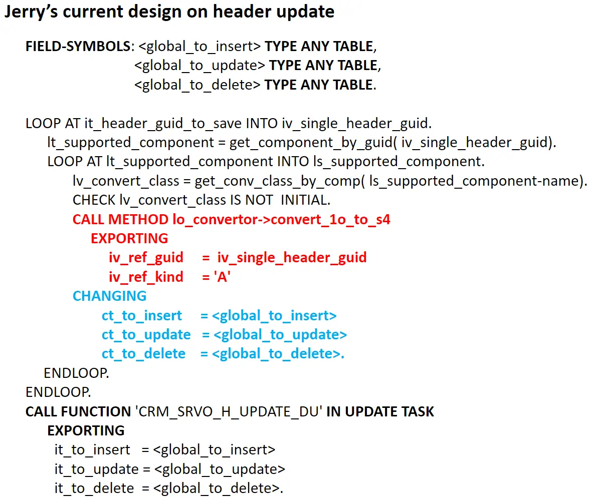 现在新的design下,所有这1368张表都不要了,所有的数据都往新的Header和item塞。怎么弄?Carsten在我来之前remote和我沟通,说他有一些draft idea,但不sure是否真的能work,需要我把这些idea变成可以运行的代码,run起来之后走一步看一步。Carsten的draft idea很粗,没有实现细节,因此我有充分发挥的空间。