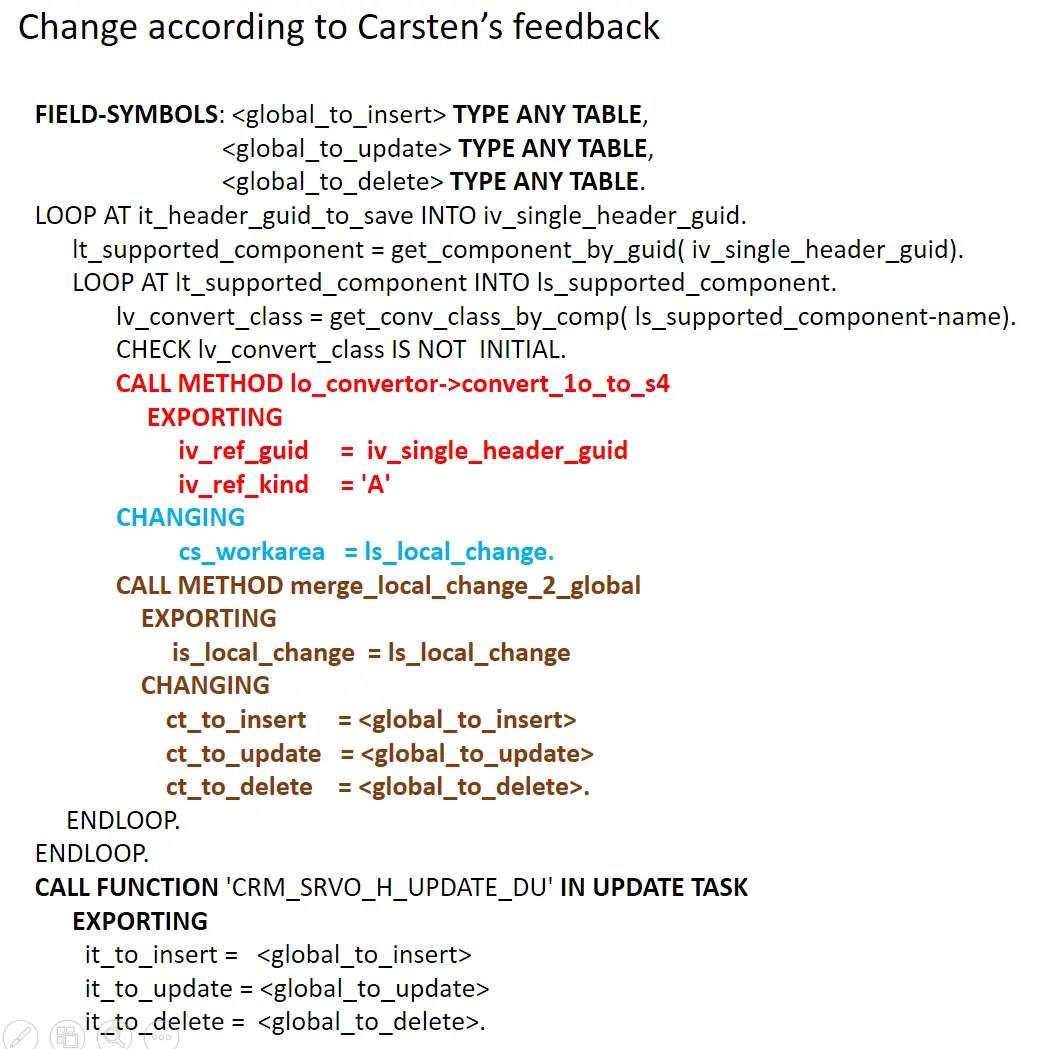 Carsten的这个proposal我最初脑子里也曾想过,但我觉得如果放到外面,这个method要能handle任意格式的Order node数据,而且需要能检测出Creation, Deletion和Update的任意一种模式,我觉得编程复杂度过高,没法给出effort estimation。如果放到convert class内部,那么内部convert class知道自己具体是什么structure,所以structure在convert里能够写死,这样做buffer merge简单得多。因此我做POC就按照简单的实现来做,没想到最后还是被Carsten callenge了。这个refact让我总结出一条结论,如果是做框架开发,具体实现复杂度不能成为影响design的决定性因素(作为参考可以).