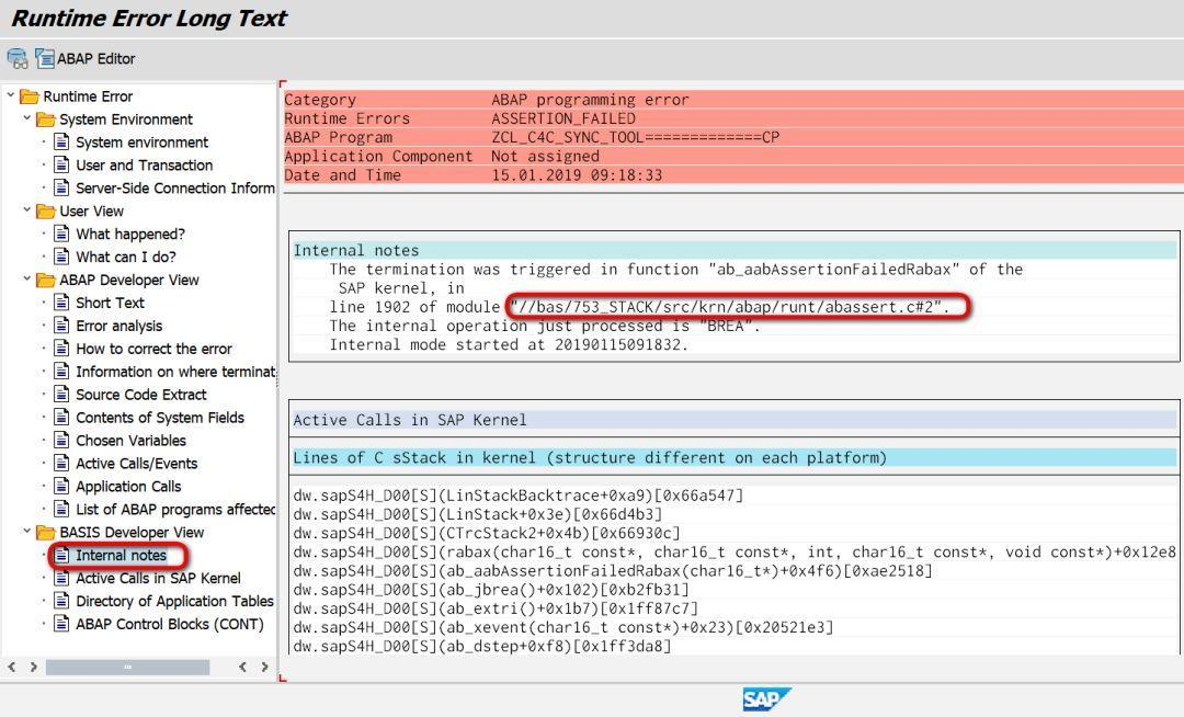 下图是ST22里dump的一个例子,值得一提的是大家可能会忽略的BASIS Developer View, 里面包含了引起运行时错误的ABAP语句对应的C语言实现的具体文件位置,比如下图的**//bas/753_STACK/src/krn/abap/runt/abassert.c**。