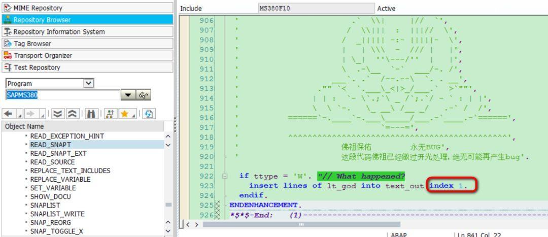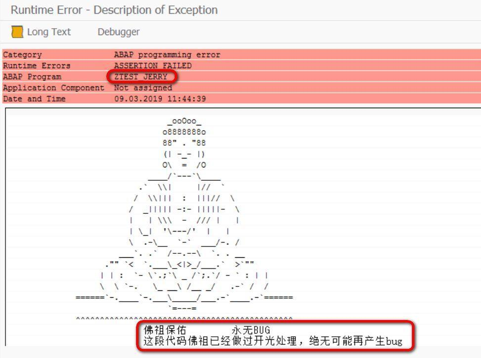 最终效果就是每次出现了运行时程序执行错误后,程序员到ST22里查看dump时,总能看到“佛祖保佑,永无BUG”几个字。