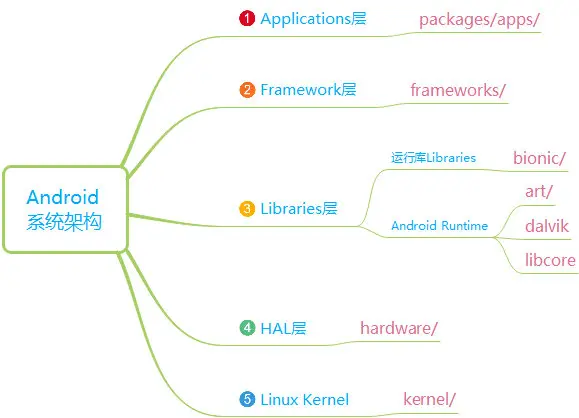 在之前的文章中介绍了一下Android系统架构,对于Android系统架构每一层,Android源码结构中都有相关目录与之对应。下图展示了在Android源码一级目录中,各框架层和部分目录的对应关系: