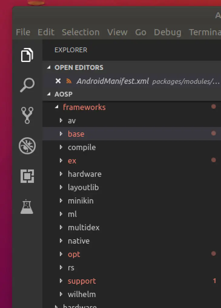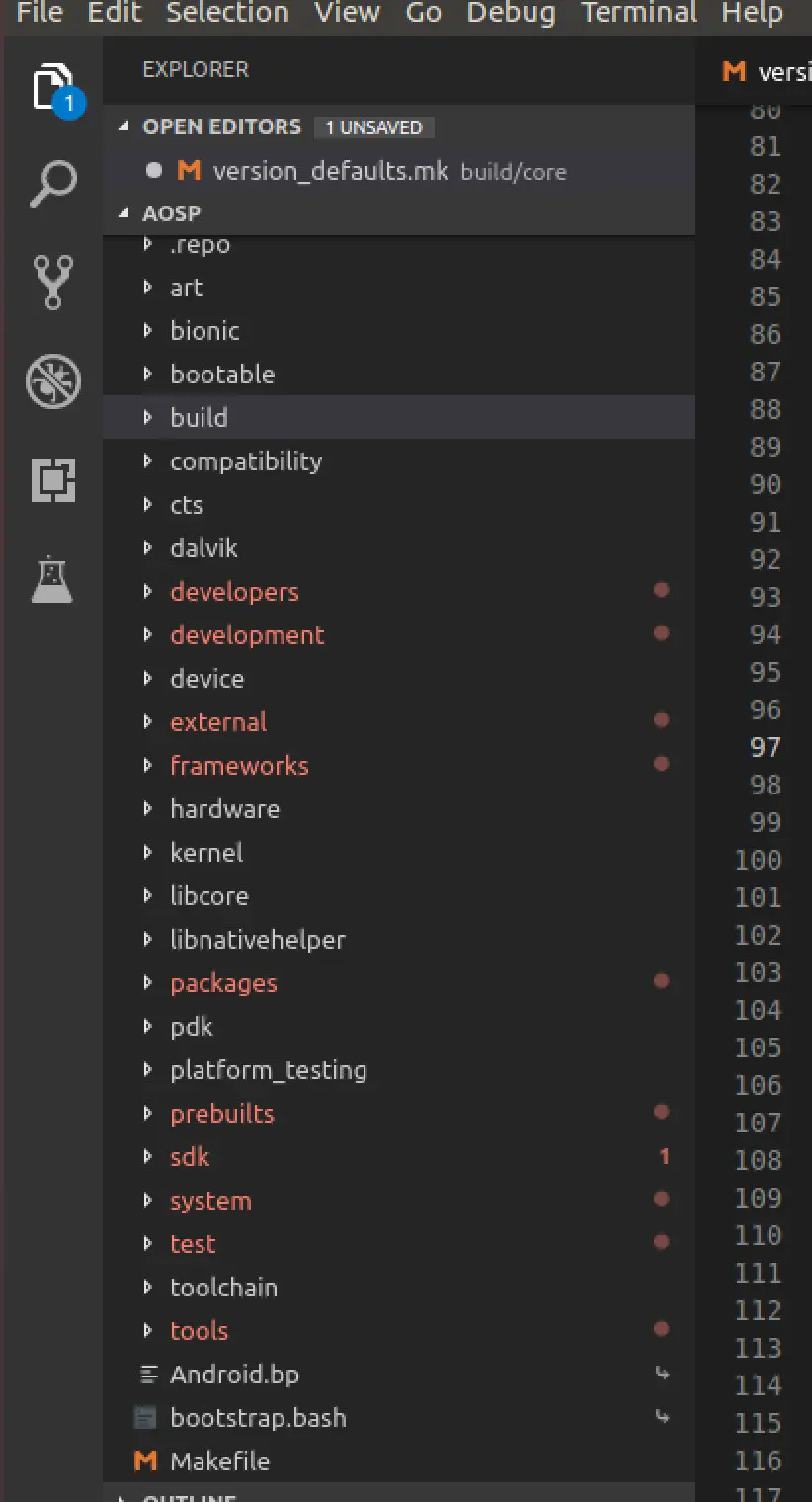 各个版本的源码目录结构基本上是大同小异,编译后的目录中会多一个out文件夹,里面用来存储编译后的文件。这里我下载的源码版本是9.0的,如果你不知道你下载的源码版本的话,可以打开build->core->version_defaults.md中找到PLATFORM_SDK_VERSION字段,PLATFORM_SDK_VERSION:=28就是Android源码的版本。Android源码目录结构如下: