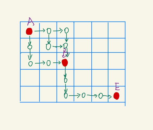 我们再回头看看上面的最短路径问题,如果在原来的基础上加上一个限制条件:同一个格子只能通过一次。那么, 这个题就不符合无后效性了,因为前一个子问题的解会对后面子问题的选择策略有影响,比如说,如果从A到B选择了一条如下图中绿色表示的路线,那么从B点出发到达E点的路线就只有一条了。也就是说从A点到B点的路径选择会影响B点到E点的路径选择。