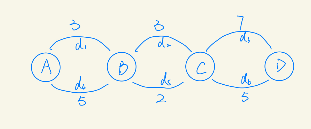 图中有四个点,A、B、C、D,相邻两点有两条连线,代表两条通道,d1,d2,d3,d4,d5,d6代表的是道路的长度,求A到D的所有通道中,总长度除以4得到的余数最小的路径为最优路径,求一条最优路径。