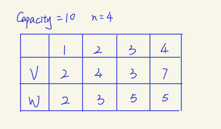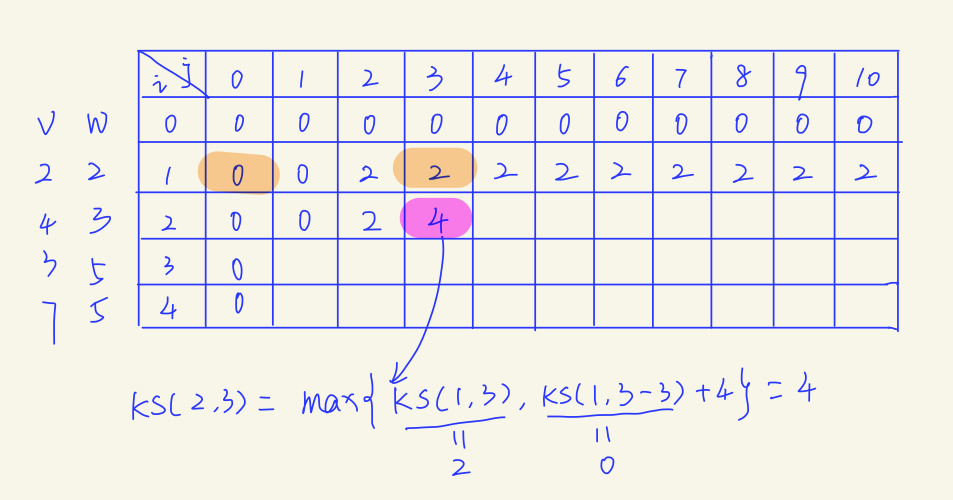 - 背包剩余容量不足以容纳该物品,此时背包的价值与前i-1个物品的价值是一样的,KS(i,j) = KS(i-1,j)