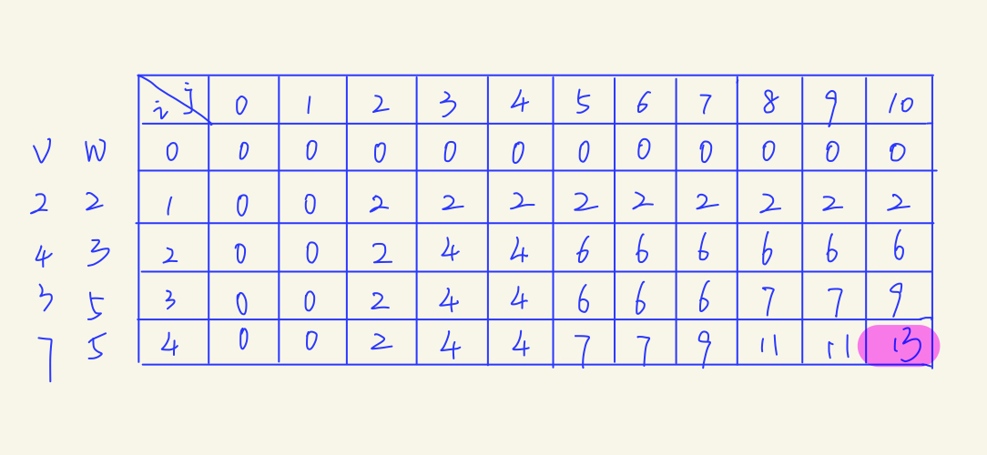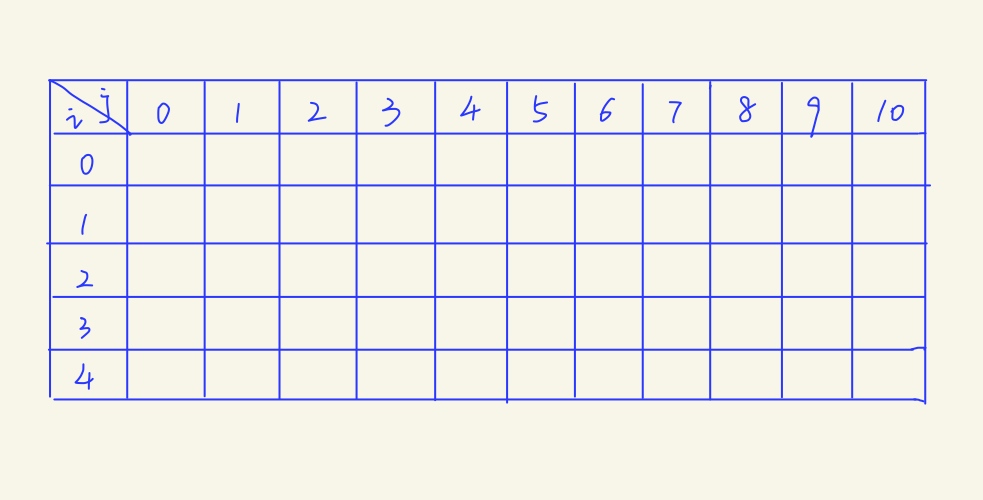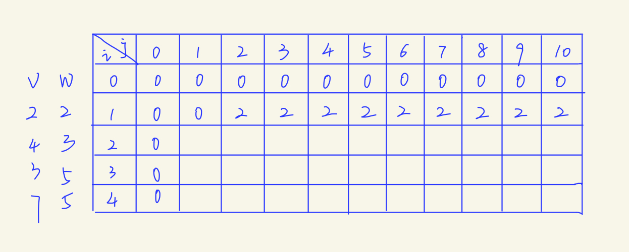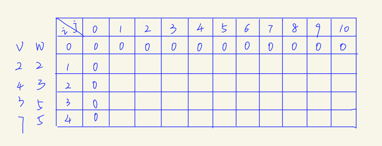 表格中,每一个格子都代表着一个子问题,我们最终的问题是求最右下角的格子的值,也就是i=4,j=10时的值。这里,我们的初始条件便是i=0或者j=0时对应的ks值为0,这很好理解,如果可选物品为0,或者剩余容量为0,那么最大价值自然也是0。代码如下: