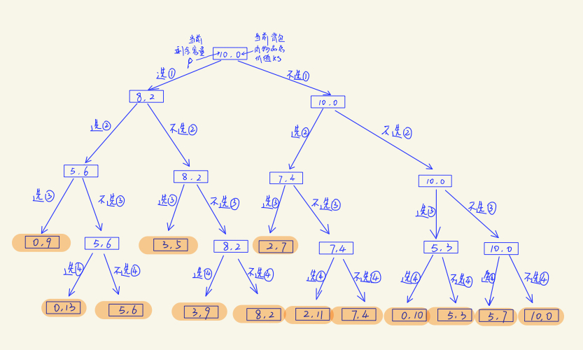 这里被涂上色的方框代表我们的最终待选结果,本来应该有16个待选结果,但有三个结果由于容量不足以容纳下最后一个珠宝,所以就没有继续进行裂变。