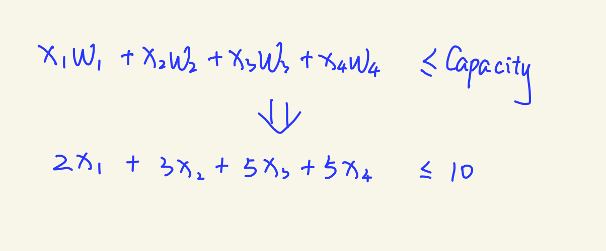 - 约束条件,x1w1 + x2w2 + x3w3 + ... + xnwn < c