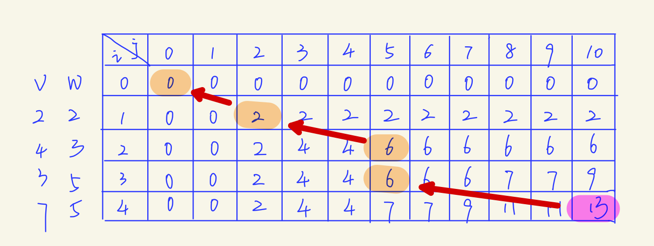 这样,我们就得到了最后的结果:13。根据结果,我们可以反向找出各个物品的选择,寻找的方法很简单,就是从i=4,j=10开始寻找,如果ks(i-1,j)=ks(i,j),说明第i个物品没有被选中,从ks(i-1,j)继续寻找。否则,表示第i个物品已被选中,则从ks(i-1,j-wi)开始寻找。