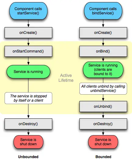 onCreate()当实例创建时调用,一个实例只会被调用一次该方法onBind(Intent)当通过bindService启动服务时,会调用该方法,该方法会返回一个IBinder实例onStartCommand()当通过startService启动服务时,会调用该方法,不停的调用startService会重复调用该方法onUnbind(Intent)当所有的连接都断开后会回调该方法,默认该方法返回false,如果返回true,再有新的连接会回调onRebind()onRebind(Intent)当onUnbind返回true后如果服务还在运行,这时又有新的连接会回调该方法onDestory()当Service将要被销毁时调用,用于资源的回收