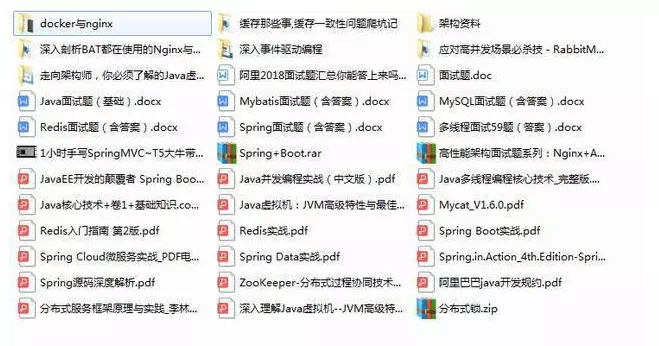 针对于上面的面试题我总结出了互联网公司java程序员面试涉及到的绝大部分面试题及答案做成了文档和架构视频资料免费分享给大家(包括Dubbo、Redis、Netty、zookeeper、Spring cloud、分布式、高并发等架构技术资料),希望能帮助到您面试前的复习且找到一个好的工作,也节省大家在网上搜索资料的时间来学习,也可以关注我一下以后会有更多干货分享。