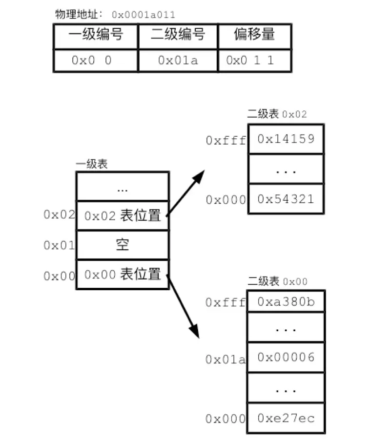 在图3的例子中,页编号分成了两级。第一级对应了前8位页编号,用2个十六进制数字表示。第二级对应了后12位页编号,用3个十六进制编号。二级表记录有对应的物理页,即保存了真正的分页记录。二级表有很多张,每个二级表分页记录对应的虚拟地址前8位都相同。比如二级表0x00,里面记录的前8位都是0x00。翻译地址的过程要跨越两级。我们先取地址的前8位,在一级表中找到对应记录。该记录会告诉我们,目标二级表在内存中的位置。我们再在二级表中,通过虚拟地址的后12位,找到分页记录,从而最终找到物理地址。