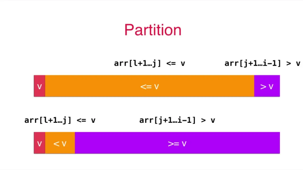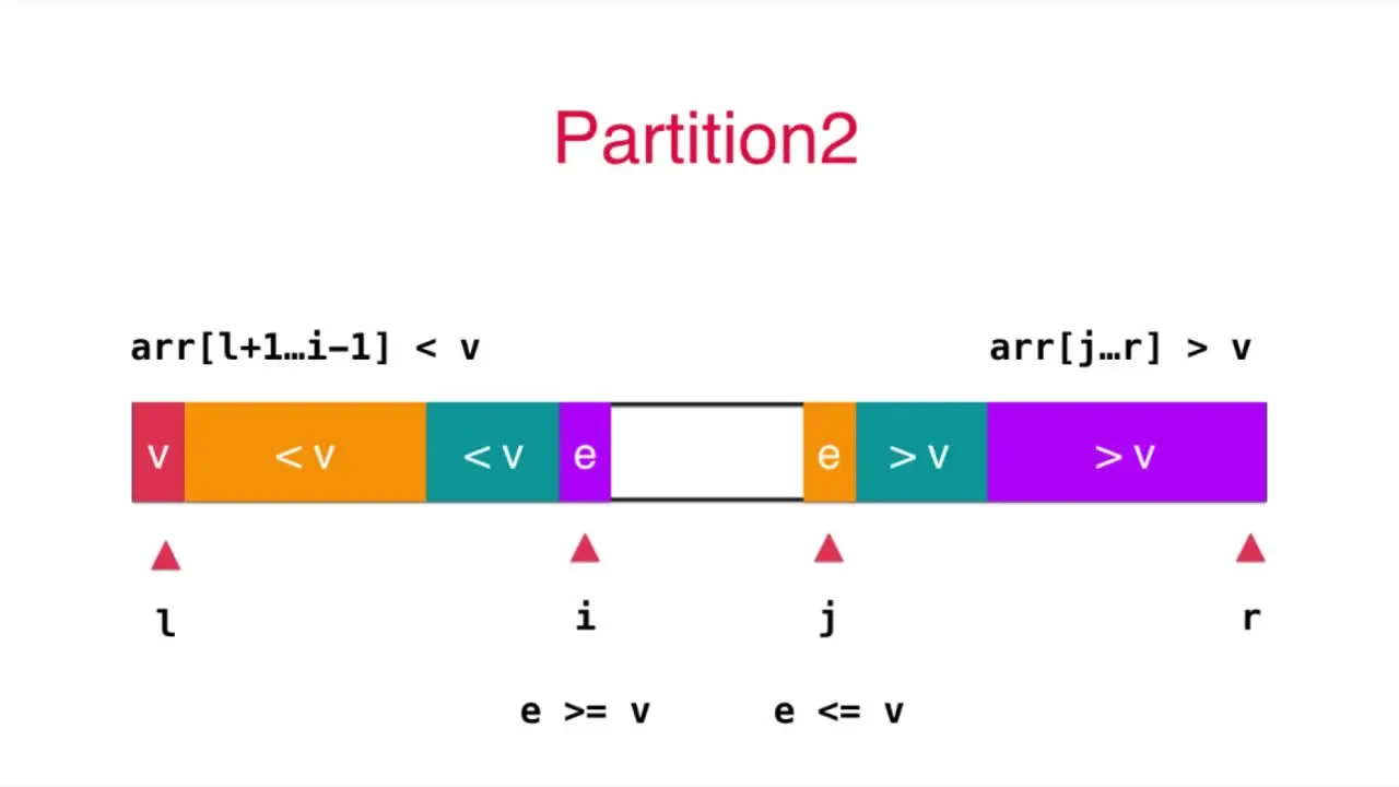 arr[l, ..., r],选定v = arr[l] 作为标定点, arr[l, ..., i) <=v, i 索引所指元素与 v 比较,小于v, i 索引右移,即i++; arr(j, ..., r] >=v, j 索引所指元素与 v 比较,大于v, j 索引左移,即j--; 如果前面两个条件不满足了,则交换 arr[i] 与 arr[j] 的值,i++, j--,继续以上比较; 最后当 i > j 时,交换 arr[l] 与 arr[j]的位置,完成排序。