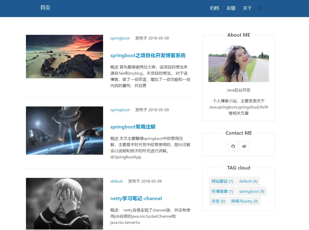 - 首页也文章列表+图片的形式展示内容,默认最大显示12篇文章,包括发布时间和分类