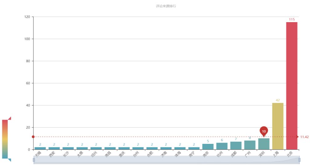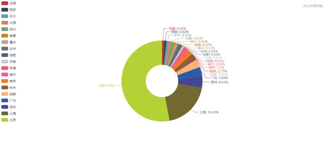 geo1 = Geo("", "评论城市分布", title_pos="center", width=1200, height=600, background_color='#404a59', title_color="#fff") geo1.add("", attr, val, visual_range=[0, 300], visual_text_color="#fff", is_geo_effect_show=False, is_piecewise=True, visual_split_number=10, symbol_size=15, is_visualmap=True, is_more_utils=True) # geo1.render(csv_file + "_城市dotmap.html") page.add_chart(geo1) geo2 = Geo("", "评论来源热力图",title_pos="center", width=1200,height=600, background_color='#404a59', title_color="#fff",) geo2.add("", attr, val, type="heatmap", is_visualmap=True, visual_range=[0, 50],visual_text_color='#fff', is_more_utils=True) # geo2.render(csv_file+"_城市heatmap.html") # 取CSV文件名的前8位数 page.add_chart(geo2) bar = Bar("", "评论来源排行", title_pos="center", width=1200, height=600 ) bar.add("", attr, val, is_visualmap=True, visual_range=[0, 100], visual_text_color='#fff',mark_point=["average"],mark_line=["average"], is_more_utils=True, is_label_show=True, is_datazoom_show=True, xaxis_rotate=45) bar.render(csv_file+"_城市评论bar.html") # 取CSV文件名的前8位数 page.add_chart(bar) pie = Pie("", "评论来源饼图", title_pos="right", width=1200, height=600) pie.add("", attr, val, radius=[20, 50], label_text_color=None, is_label_show=True, legend_orient='vertical', is_more_utils=True, legend_pos='left') pie.render(csv_file + "_城市评论Pie.html") # 取CSV文件名的前8位数 page.add_chart(pie) page.render(csv_file + "_城市评论分析汇总.html")