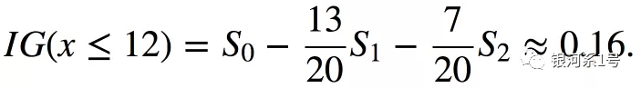 有9个蓝色球和11个黄色球。如果我们随机抽出一个球,那么它将是蓝色,概率为p1 = 9/20,黄色概率为p2 = 11/20,这给了我们一个熵S0 = -9/20 log2(9/20) - 11 / 20 log2(11/20)≈1。这个值本身可能不会告诉我们太多,但让我们看看如果我们将球分成两组,值如何变化:位置小于或等于12且大于12。