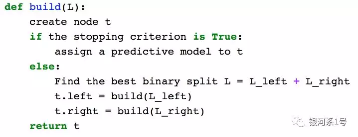 决策树构造的流行算法(如ID3或C4.5)的核心在于信息增益的贪婪最大化原则:在每一步,算法选择在分裂时提供最大信息增益的变量。然后递归地重复该过程,直到熵为零(或者一些小的值来解释过度拟合)。不同的算法使用不同的启发法来“提前停止”或“切断”以避免构造过度拟合的树。