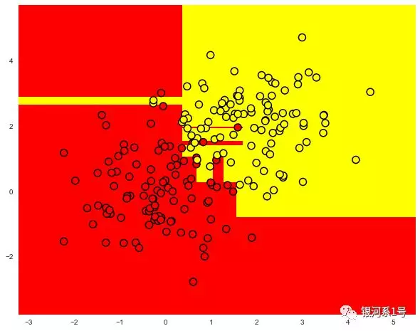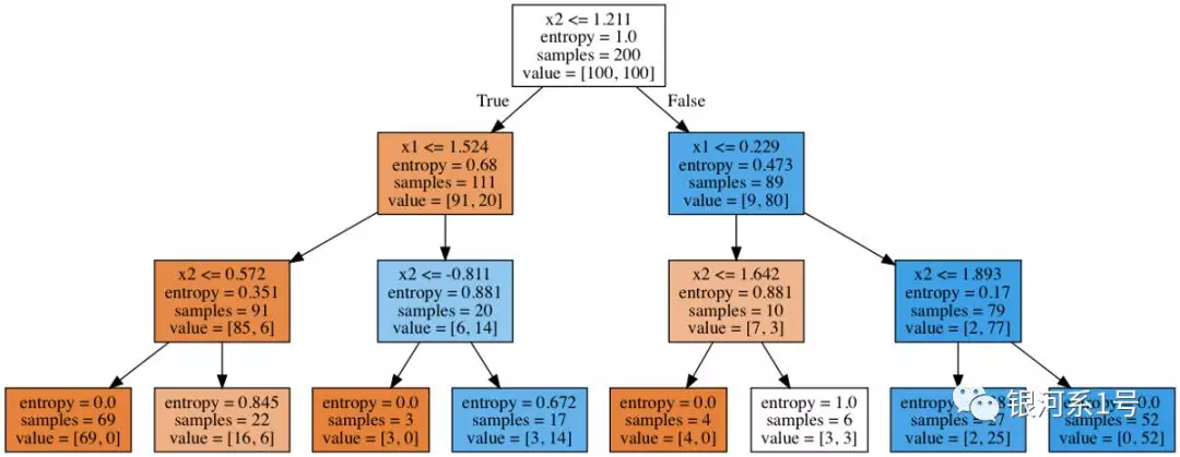 树本身看起来如何?我们看到树将“空间”切割成8个矩形,即树有8个叶子。在每个矩形内,树将根据其中对象的多数标签进行预测。