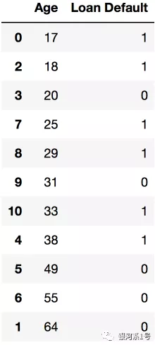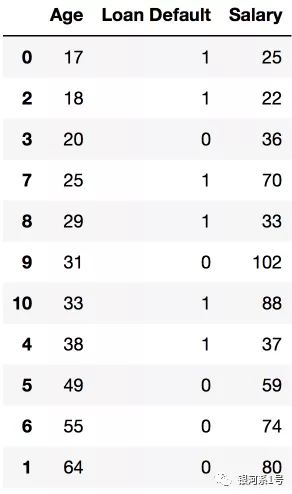 data2 = pd.DataFrame({'Age': [17,64,18,20,38,49,55,25,29,31,33], 'Salary': [25,80,22,36,37,59,74,70,33,102,88], 'Loan Default': [1,0,1,0,1,0,0,1,1,0,1]})data2.sort_values('Age')