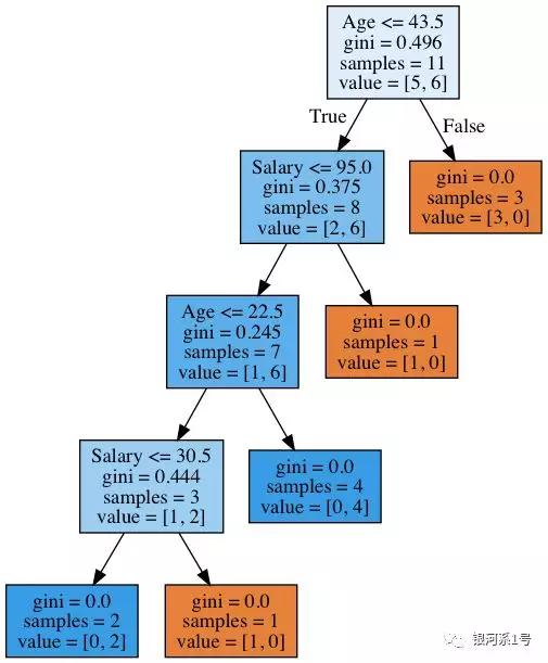 我们看到树由工资和年龄划分。此外,特征比较的阈值分别为43.5和22.5岁,每年95k和30.5k。再次,我们看到95是88到102之间的平均值; 工资88k的个人证明是“坏”,而102k的个人是“好”。同样适用于30.5k。也就是说,只搜索了几个按年龄和工资进行比较的值。树为什么选择这些功能?因为他们给出了更好的分区(根据基尼的不确定性)。