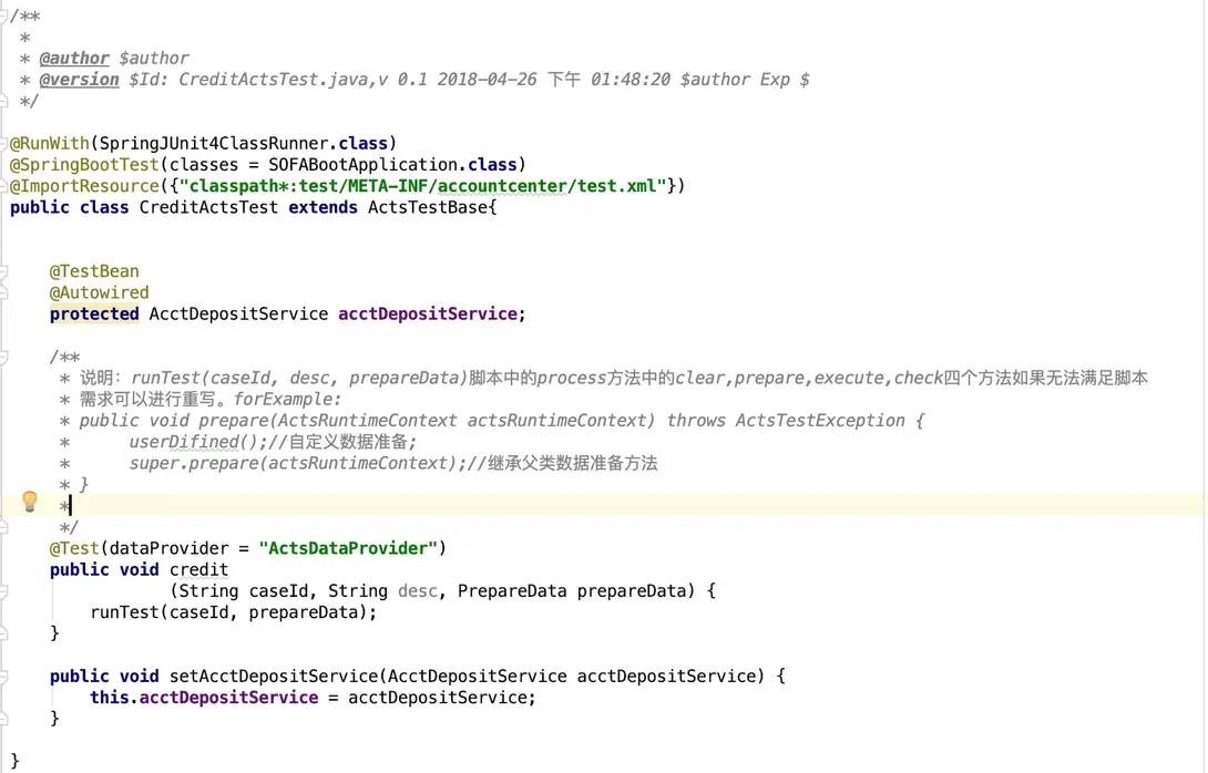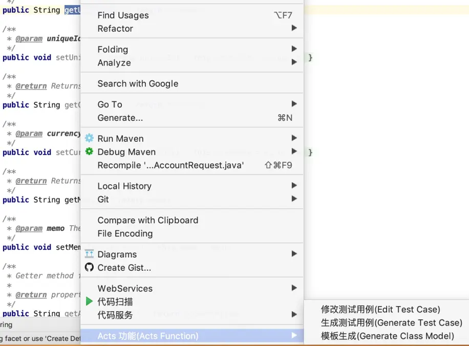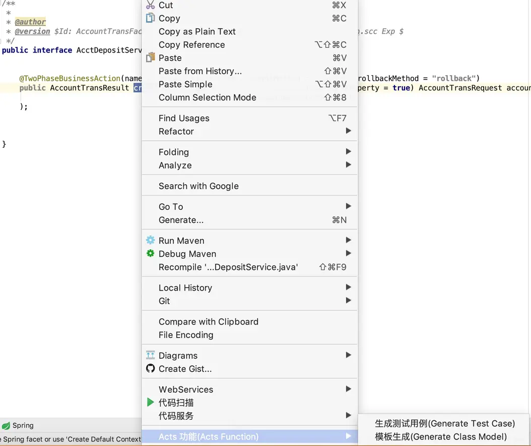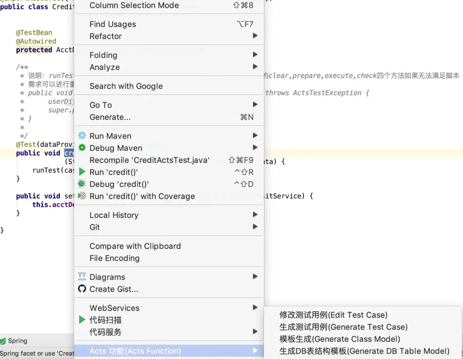 1.被测接口方法上点击,选择 SOFAACTS 功能-->生成测试用例;