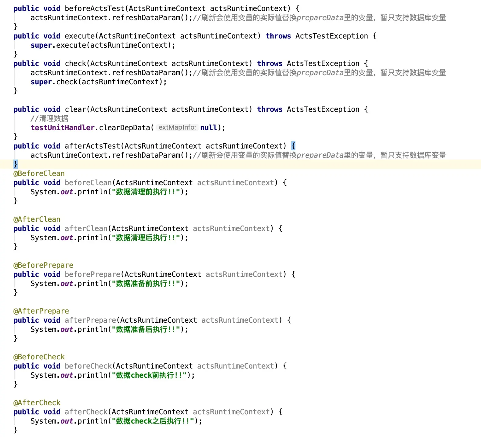 框架为了应对各种特殊业务测试情况而不需要过多改动,设计上应用高内聚与低耦合原则,支持既可以复用框架底层代码又可以针对业务个性化情况做扩展的能力。整个框架提供了丰富的 API,测试执行过程每个方法、每个类以便测试执行过程的每个阶段(如下图)都能够在测试脚本里面被重新为其他方法或者被其他多态的子类替换,这样让框架变得更通用,既赋予了框架轻量性又增加了灵活性。