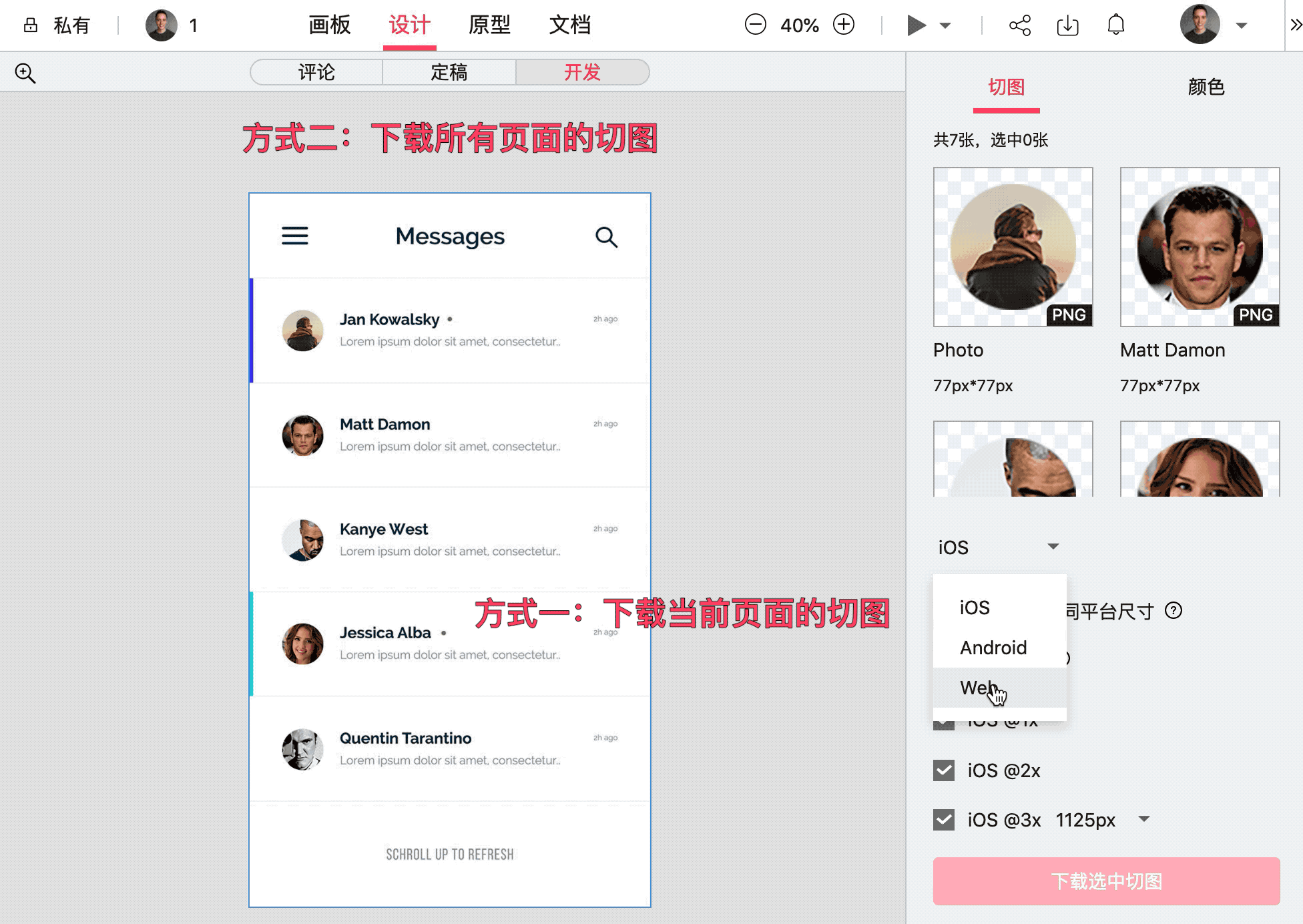 摹客iDoc最新更新的“自动换算不同平台尺寸”的功能,完美解决了UI与开发间切图尺寸的问题!UI只要上传一份设计稿到iDoc(无论是ios还是Android),开发人员在iDoc内选择好适配的设备,iDoc就可以自动换算不同平台尺寸的切图,一键下载,分分钟搞定!