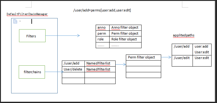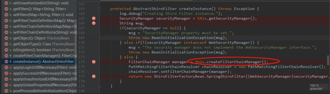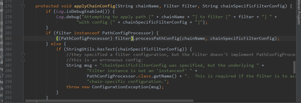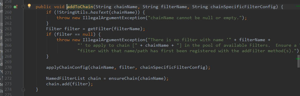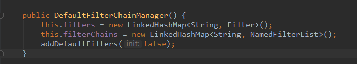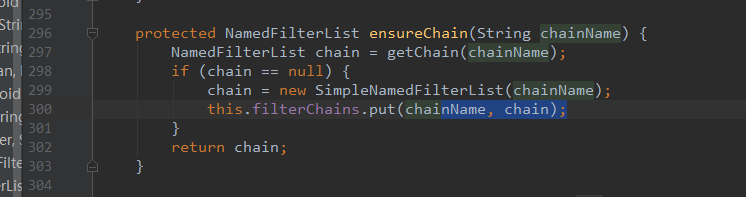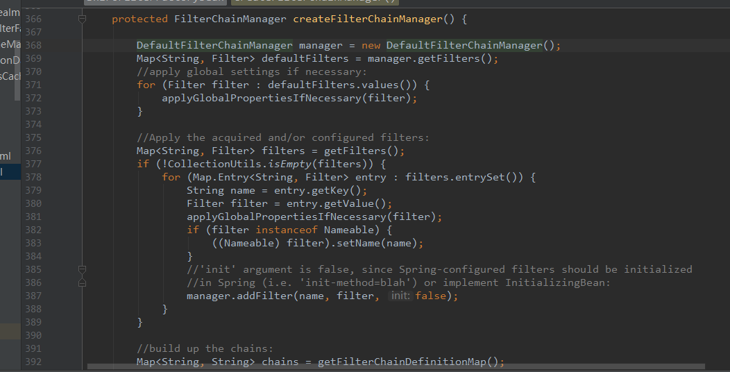 回到第3步的376-389行,将我们自定义的拦截器初始化配置并添加到DefaultFilterChainManager中,至此,我们的所有过滤器们(包括默认的以及我们自定义的)已经全部初始化完了,都存在DefaultFilterChainManager中。