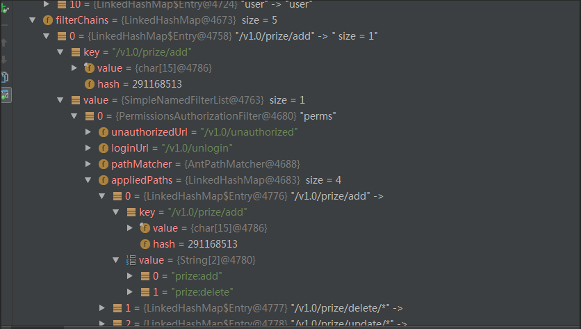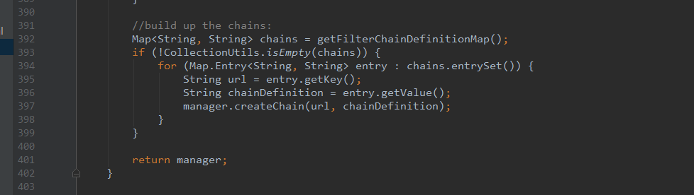 4、继续看392行,现在开始初始化FilterChains(构建过滤链) 这里392行获取我们所配置的权限列表,例如(/user/**=authc,perms[user:add,user:delete],这里等号左边表路径,perms是拦截器名称,user:add是需要的权限),这里开始遍历map,解析每条配置