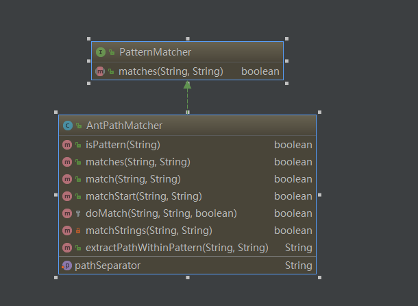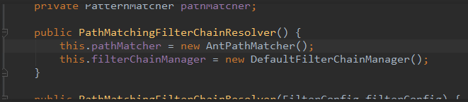 6、可以看到,这样就建立了url与过滤器之间的关联。既然url已经与过滤链进行了关联,那么我们在处理时只需要将请求的url与我们配置的url进行一个逐条比对,就可以获取到这个过滤链了。可见我们还需要一个PathMacher(路径比对器),现在回到第2步中的175-176行,这里他为我们new了一个PathMatchingFilterChainResolver,看看这个类,构造方法里面就有了一个默认的AntMathMatcher(这是一个ant风格的路径匹配器),并把filterChainManager注入到了里面,对上层调用者提供了一层封装,调用者只需要调永chainResolver.getChain(request)就可以获取到这个请求对应的过滤链了。