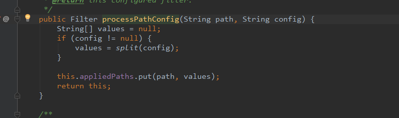 点进397行createChain(url,"authc,perms[user:add,user:delete]")方法,在第140行首先对authc,perms[user:add,user:delete]进行切分,切分后结果为string[0]=authc,string[1]=perms[user:add,user:delete],然后在144行对切分后的字符串循环遍历进行操作,以perms[user:add,user:delete]为例。145行返回string[0]=perms,string[1]=user:add,user:delete。最后调用148行添加过滤链,chainName=url,nameConfigPair[0]为过滤器名,nameConfigPair[1]为过滤器针对这个url的配置