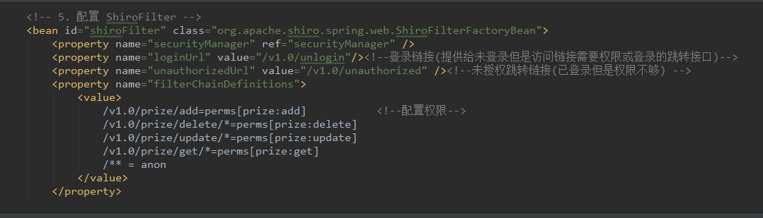 这个部分宏观上来讲,只做了一个工作,就是构建了ShiroFilter。首先给出shiroFilter的配置文件spring-shiro.xml