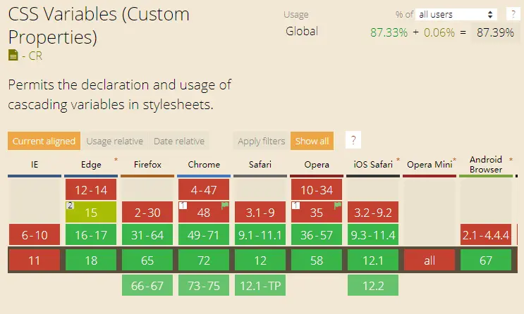 目前,全球网站流量的 87.39% 支持CSS变量。我们已经在 Scrimba.com 上使用 CSS 变量,因为我们的客户大多使用现代浏览器。