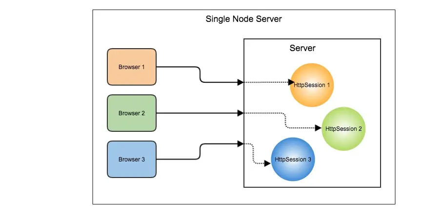 通常在生产环境中,我们将有多个服务器节点,其前面有一个负载平衡器,所有客户端流量将通过负载平衡器到达其中一个服务器节点。因此,我们需要一些机制来使用户会话数据可用于群集环境中的每个客户端。