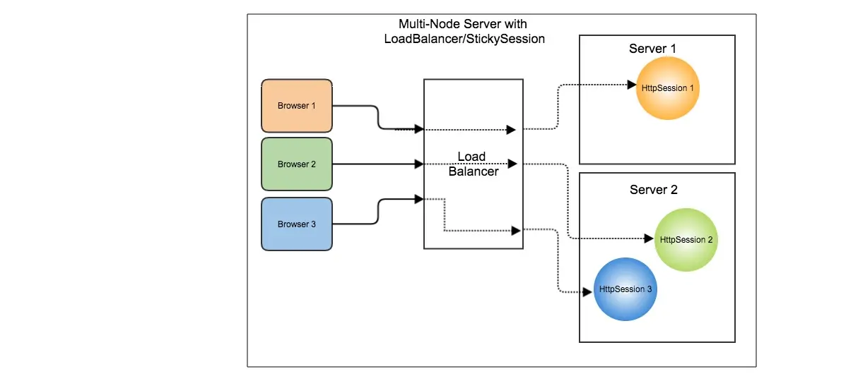 为了使我们的应用程序高度可用并满足更多用户,我们可以在负载均衡器后面有多个服务器节点。在Sticky Sessions方法中,我们将负载均衡器配置为将来自同一客户端的所有请求路由到同一节点。